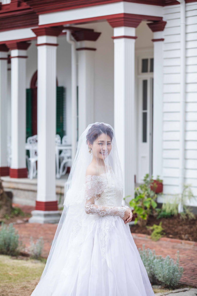 フェアリーのような雰囲気を持った花嫁さまにはとっても繊細なフランス製レースをチョイス。そしてスカートには動きのある、軽やかでありながらハリや重厚感さえ思わせるウエディングらしいシルクメッシュを使用しました。裏側には何層ものチュールを重ね、たっぷりとボリュームをあたえることでうっすらとボディラインが見える幻想的なドレスに。
